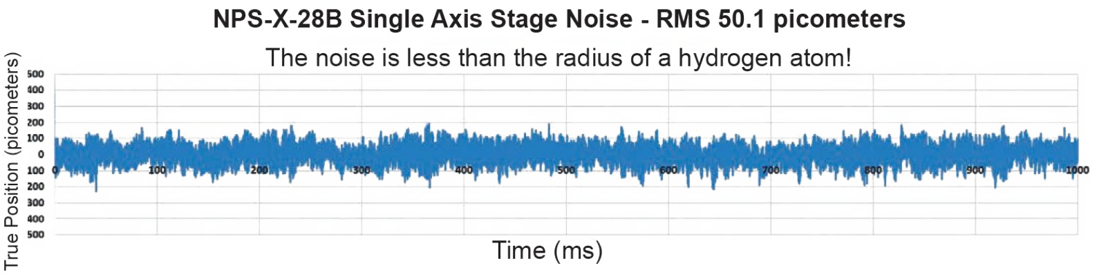 在實際測試中,單軸壓電平臺的位置噪聲為 50.1 pm RMS,這一噪聲水平小于氫原子半徑,適用于對精度和穩(wěn)定性要求高的場景,如尖端科學研究、精密測量或高端制造等領(lǐng)域。