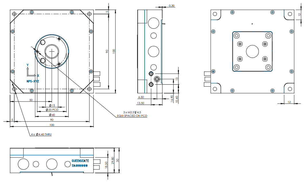NPS-XYZ-100D-20H 平臺搭載 Queensgate 的 NanoMechanism 技術,XY 軸的行程為 100 × 100 微米,Z 軸為 20 微米。