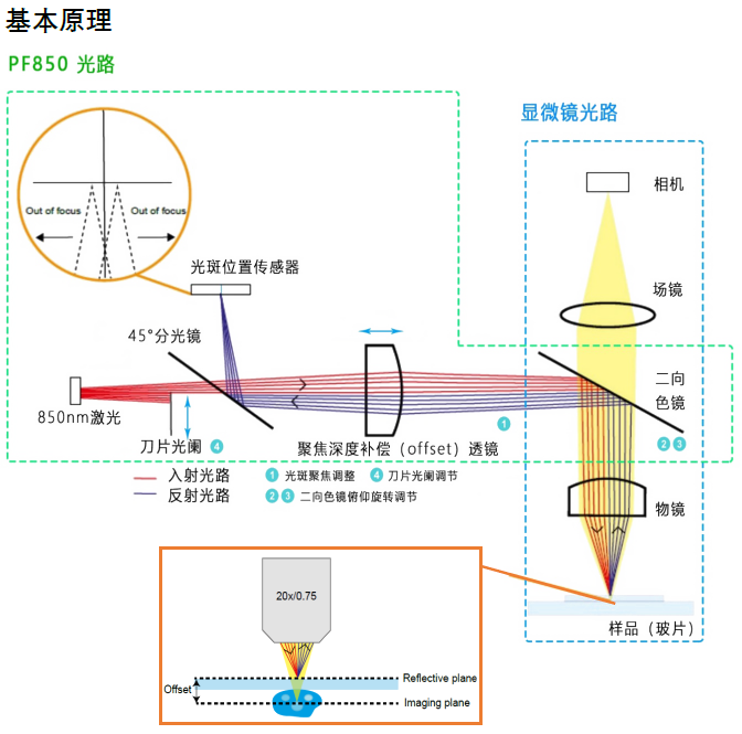 PF850 中包含了紅外激光二極管,精密光學(xué)元件,激光探測器,以及微處理電路。激光信號通過光學(xué)元件耦合到物鏡中,通過樣品反射之后被探測器獲得,并通過電路將信號輸出到步進(jìn)電機(jī)或者壓電平臺,來完成自動對焦。