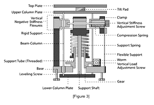 下圖為負(fù)剛度隔振平臺(tái)的結(jié)構(gòu)圖,合并了垂直以及水平方向的隔振器,一塊橡膠可傾瓦作為傾斜隔振器。 垂直剛度調(diào)節(jié)螺釘用于調(diào)節(jié)負(fù)剛度結(jié)構(gòu)中片彈簧上的壓力,從而改變垂直剛度。垂直負(fù)載調(diào)節(jié)螺通過(guò)升降支撐彈簧的底座來(lái)調(diào)整不同的重量負(fù)載,以保持片彈簧處于筆直、不彎曲的工作位置。以上特點(diǎn)可以使單隔振器工作,并在多隔離器系統(tǒng)中實(shí)現(xiàn)自動(dòng)調(diào)平。