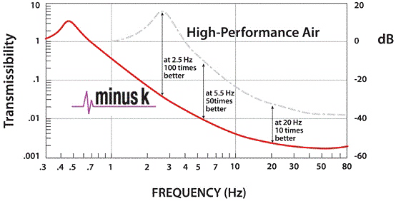 基于現(xiàn)場(chǎng)測(cè)試以及客戶的評(píng)估,MinusK的隔振平臺(tái)可以實(shí)現(xiàn)0.5 Hz的固有頻率,相較于市場(chǎng)上的高性能空氣隔振平臺(tái),在不同的振動(dòng)頻率下,隔振性能可以提高100倍。對(duì)主動(dòng)隔振平臺(tái),也具有明顯的優(yōu)勢(shì)。