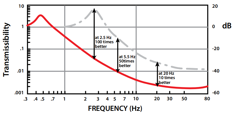 基于現(xiàn)場測試以及客戶的評估,MinusK的隔振平臺可以實現(xiàn)0.5 Hz的固有頻率,相較于市場上的高性能空氣隔振平臺,在不同的振動頻率下,隔振性能可以提高100倍。對主動隔振平臺,也具有明顯的優(yōu)勢。