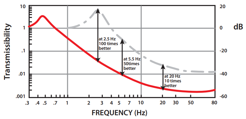 基于現(xiàn)場測試以及客戶的評(píng)估,MinusK的隔振平臺(tái)可以實(shí)現(xiàn)0.5 Hz的固有頻率,相較于市場上的高性能空氣隔振平臺(tái),在不同的振動(dòng)頻率下,隔振性能可以提高100倍。對(duì)主動(dòng)隔振平臺(tái),也具有明顯的優(yōu)勢。